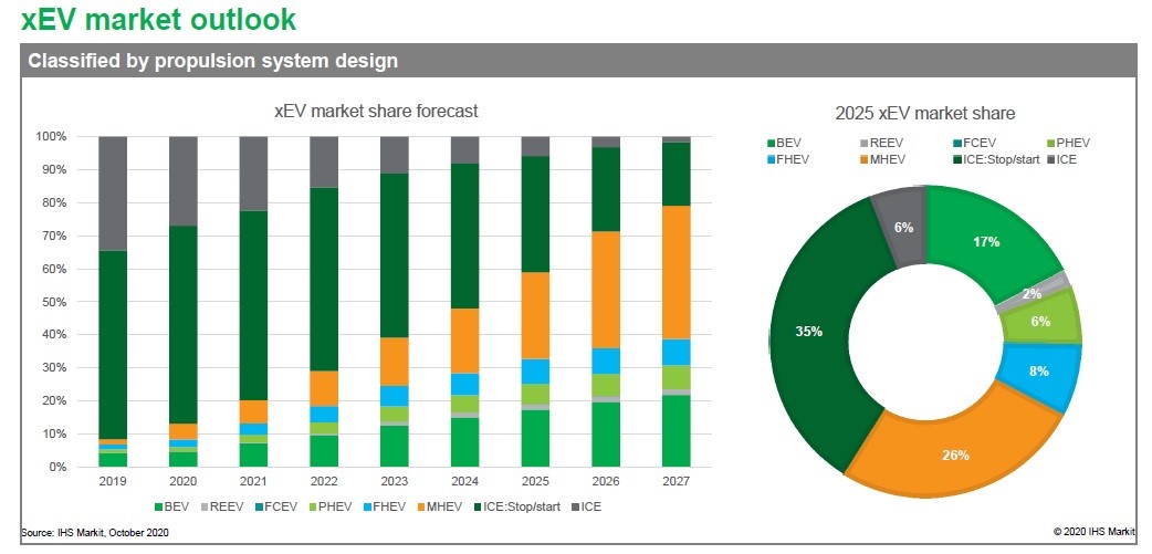 图1:2019-2027年xEV市场展望(来源:IHS Markit)