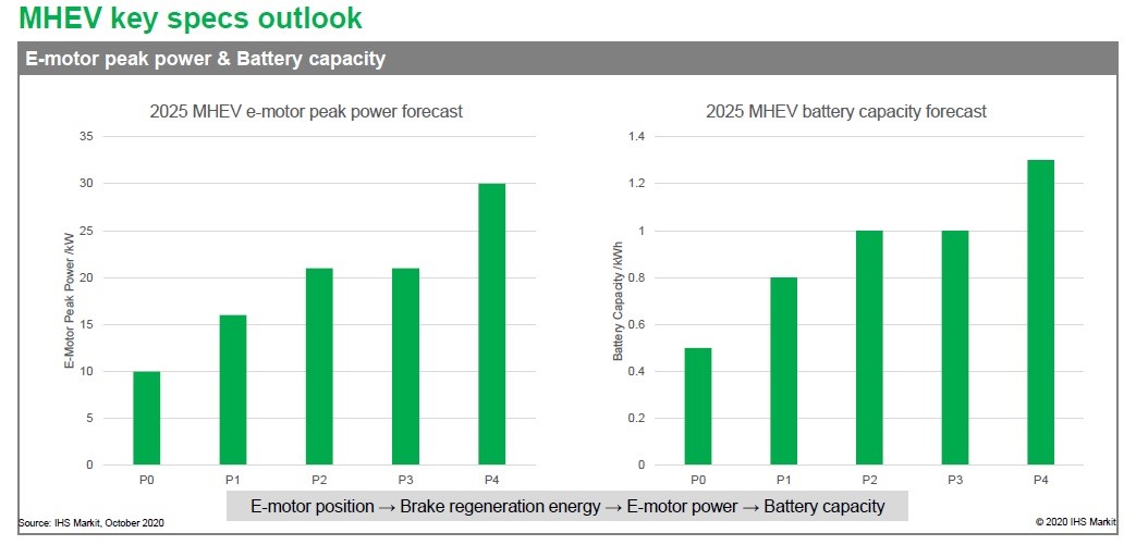 图4:MHEV P0-P4车型电动机功率和电池容量发展趋势(来源:IHS Markit)