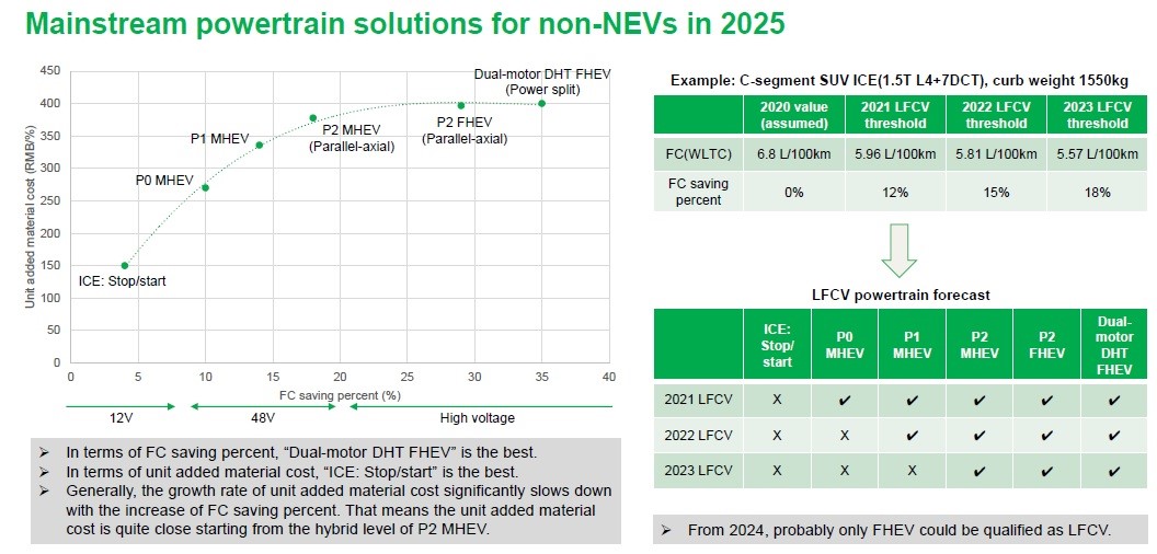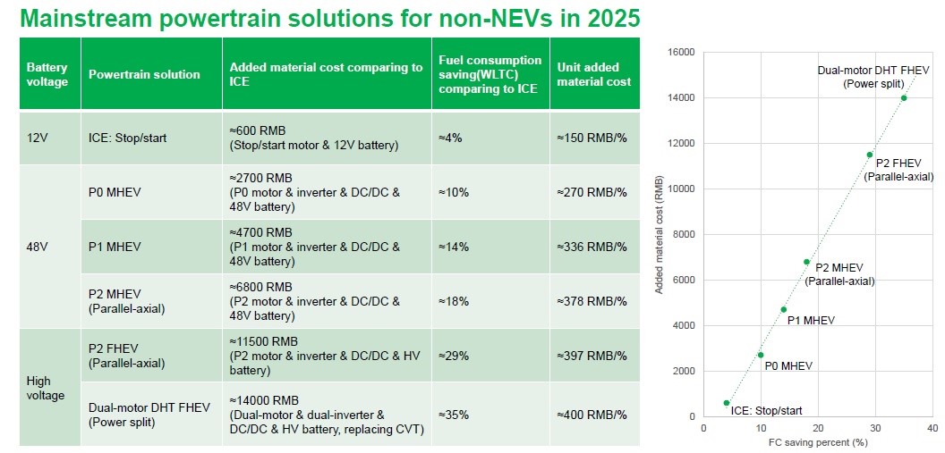 所谓的“附加成本”,指的是对比于纯ICE车辆,从12V启停、48V P0、48V P1、48V P2,再到高压P2以及高压双电机DHT,分别所增加的物料成本。然后再通过节油率指标来进行衡量,节油率也是对比于纯ICE车辆而言,例如48V P0,预计它的附加成本,以2025年为例,可能增加2700元人民币,其带来的节油率是10%左右,从而计算出性价比,即每实现1%的节油率,成本为270元。采取这样的对比思路,参考图5右侧图表(横轴为节油率,纵轴为对应的附加成本)可以发现,从发动机启停,到较高层次的双电机DHT混动方案,附加成本与节油率之间基本呈现近似直线的正比关系。