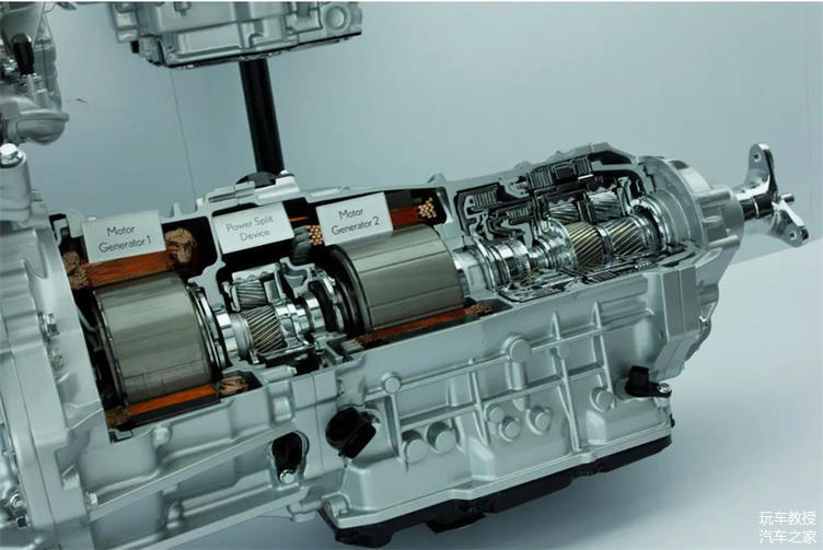 被我搞蒙了?这么跟大家说吧,e-CVT实际上是油电混动系统中,连接内燃机飞轮和半轴之间的一套耦合系统。e-CVT中的“e”代表的是驱动电机,就是油混车里实现EV模式的那台驱动电机。而e-CVT系统(注意了,我们再也没有把它称之为变速箱)的传动部分,也就是传统意义上“变速箱”的部分,每个厂家的结构都不一样。