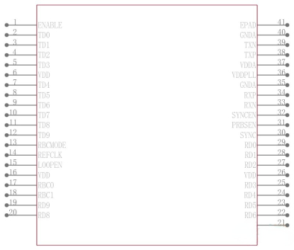 TLK1221RHAR为物理层接口器件执行数据串行化、解串行化和时钟提取功能。收发器以1.25Gbps(典型值)运行,通过铜缆或光学媒体接口提供高达1Gbps的数据带宽。该器件支持定义的10位接口(TBI)。在TBI模式下,串行器/解串器(SERDES)接受10位宽的8b/10b并行编码数据字节。并行数据字节在PECL兼容电压电平下串行化和差分传输。SERDES从输入串行流中提取时钟信息并解串数据,输出并行10位数据字节。TLK1221RHAR采用高性能、耐热增强型40引脚QFN封装。使用此封装不需要任何特殊考虑,只是要注意焊盘是器件底部的裸露芯片焊盘,是金属导热和导电体。需要将TLK1221RHAR焊盘焊接到板上的散热焊盘,因为它用作设备的主要接地连接。它的工作温度范围为–40°C至85°C。该器件使用2.5V电源。I/O部分兼容3.3V。使用2.5V电源,该芯片组非常节能,以1.25Gbps运行时消耗的典型功率低于200mW。TLK1221RHAR设计为支持热插拔。上电复位会使RBC0、RBC1、并行输出信号端子、TXP和TXN保持在高阻抗状态。